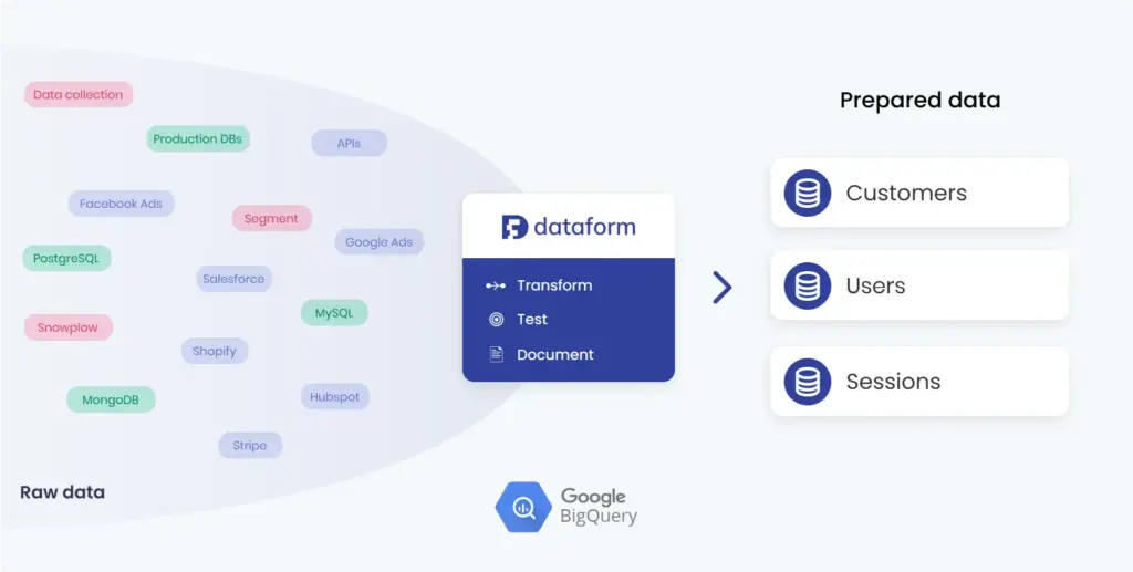 As you can see in the image above, Dataform can be used to prepare data for use as a source for dashboards or reporting in general.